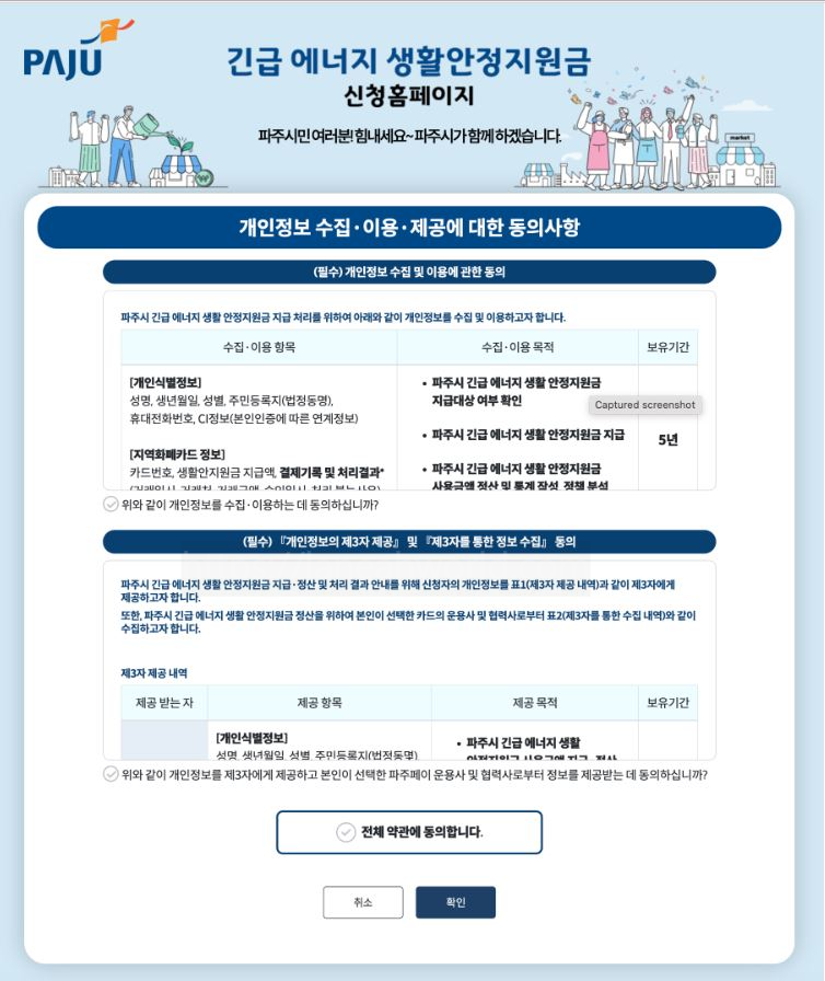그러면 아래 이미지와 같이 개인정보 수집, 이용, 제공에 대한 동의사항 약관 페이지가 나옵니다. 저희는 지원금을 받아야 하니 '전체 약관에 동의합니다.'를 체크하시고 확인을 눌러주세요!