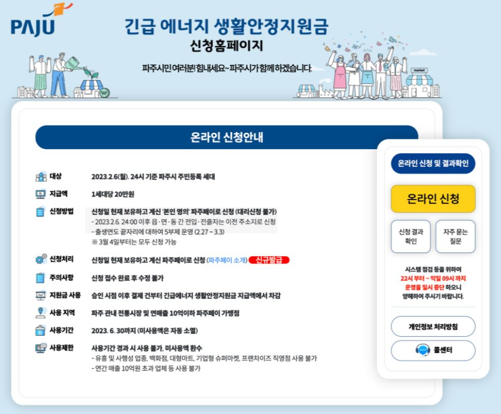 파주에서 긴급 에너지 생활안정지원금(난방비 지원금)을 한 가구당 20만 원씩 지급한다고 합니다. 물론 현금으로 받으면 더 좋겠지만 난방비 지원금은 <파주 페이>로 지급됩니다. 기간은 2023년 2월 27일 (월) ~ 2023년 3월 31일 (금)까지 신청이 가능하니 파주시민분들은 서둘러서 신청하셔야겠습니다. 생각보다 신청하는 방법이 복잡하지 않으니 제 포스팅 보시면서 순서대로 따라 해주세요! 호로록 신청을 끝낼 수 있습니다!